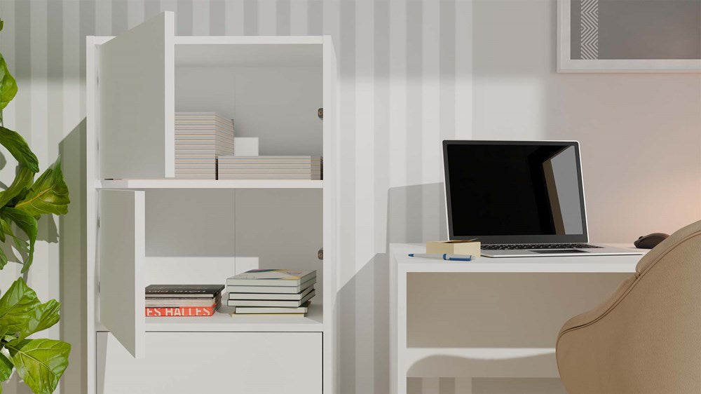 Grâce aux vastes étagères dissimulées derrière les quatre portes lisses, la commode offre un grand espace de rangement et permet de garder facilement n'importe quel espace en ordre.