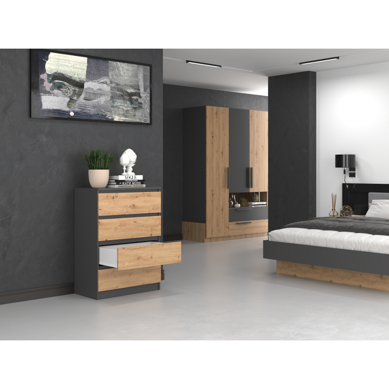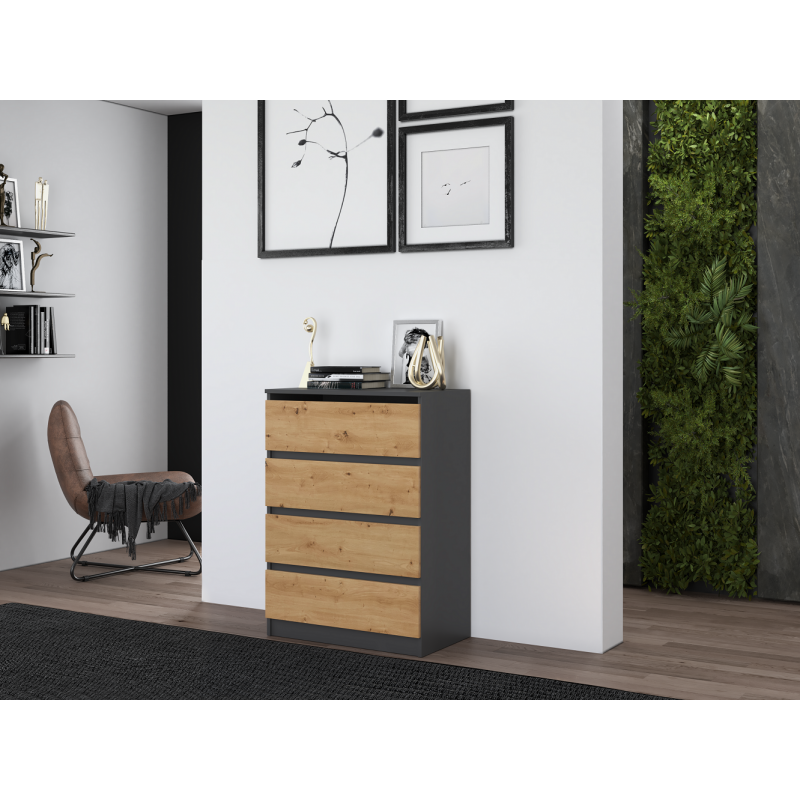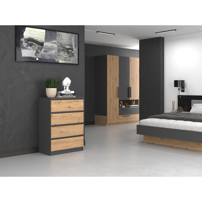 Commode Aster à quatre tiroirs apportera une touche de modernité et harmonie à votre chambre. Avec sa matière, ses lignes épurées et ses détails, elle s'accordera parfaitement à votre intérieur. Sa structure en panneaux de particules mélaminés se caractérise par une grande durabilité et une finition tendance.