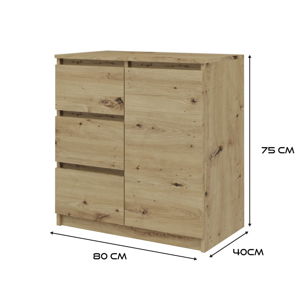 Ce buffet de style moderne est un meuble fonctionnel et spacieux, qui permet d'aménager l'intérieur du salon ou de la salle à manger. Son design universel répondra aux attentes de tous ceux qui apprécient la combinaison de la simplicité et de l'élégance. L'intérieur du meuble comprend des étagères et trois tiroirs, grâce auxquels vous pourrez bien organiser divers objets.