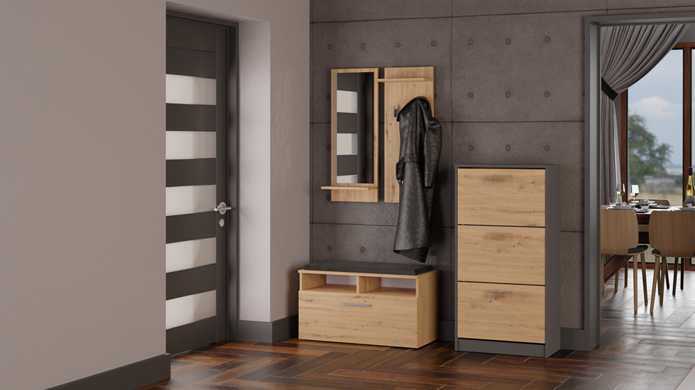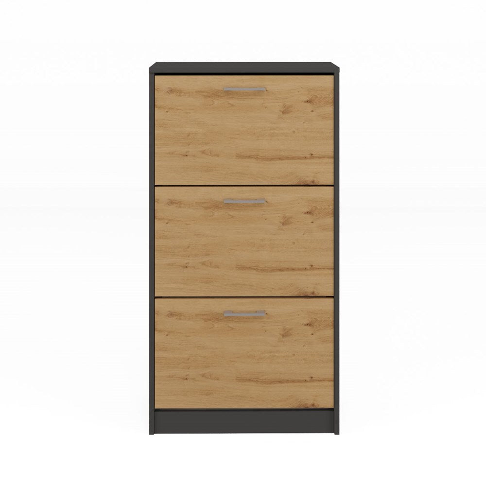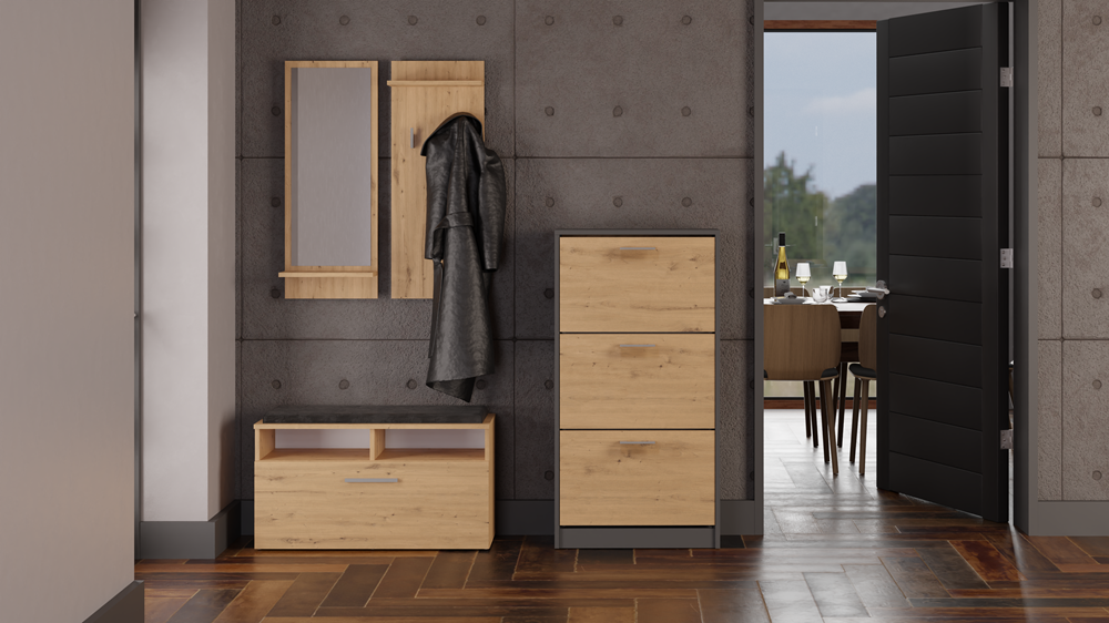 Meuble à chaussures FANO épuré et élégant, sera idéal dans votre entrée. Il est peu encombrant, grâce à ses dimensions compactes et conviendra parfaitement aux petites pièces. Il est aussi ultra fonctionnel grâce à ses 3 portes de rangement chaque avec deux rangs à chaussures. Sa structure en panneaux de particules mélaminés se caractérise par une grande durabilité et une finition tendance