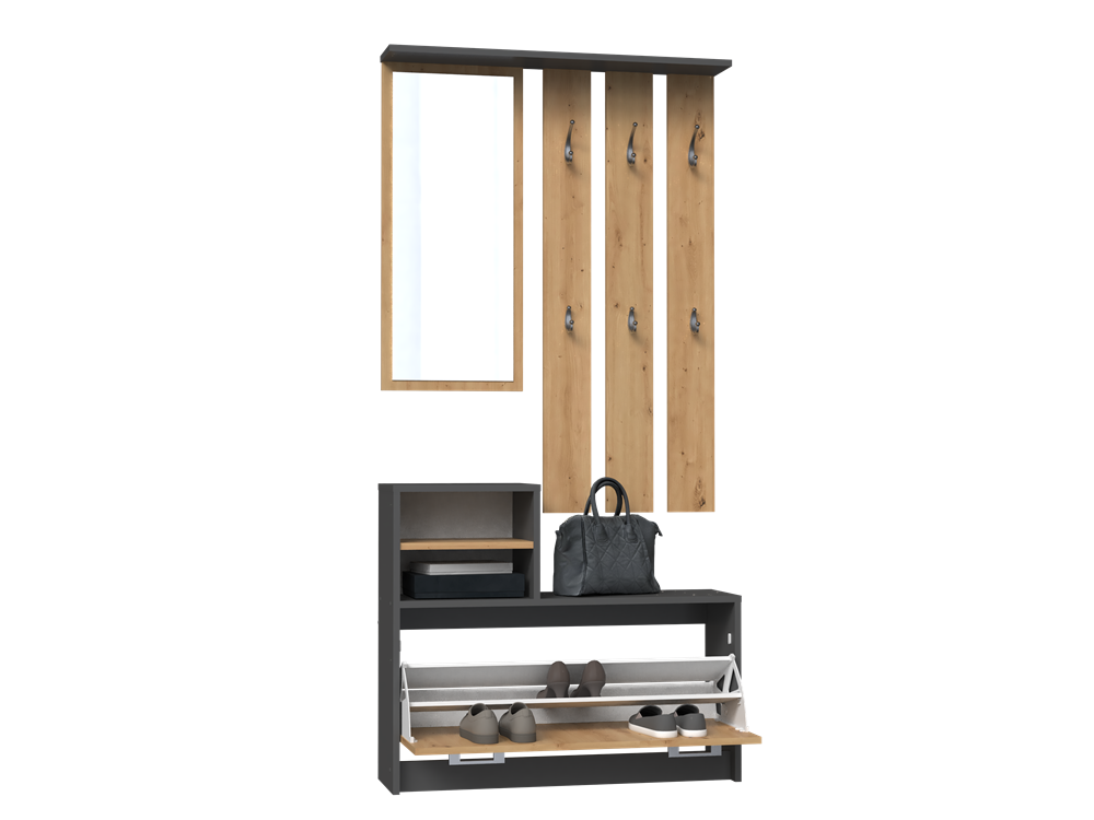 Le meuble d'entrée Vittoria est très pratique avec ses six crochets pour suspendre les manteaux, son grand miroir, ses deux niches et son étagère. Il peut contenir jusqu'à 9 paires de chaussures dans son espace de rangement. Sa structure en panneaux de particules mélaminés est durable et tendance. Ce meuble s'adapte à tous les styles et est idéal pour ranger vos affaires.